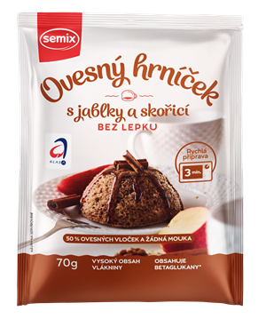 Složení: OVESNÉ vločky bez lepku 50 %, cukr, sušená jablka 10 %, mletý len, sušená VEJCE, olivový olej, kukuřičný škrob, kypřící látky (hydrogenvinan draselný, hydrogenuhličitan sodný), rostlinná vláknina, mořská sůl, mletá skořice 0,4 %, zahušťovadlo (hydroxypropylmetylcelulóza), aroma. Může obsahovat stopy sóji, skořápkových plodů, mléka a sezamu. Maximální obsah lepku 20 mg/kg.
